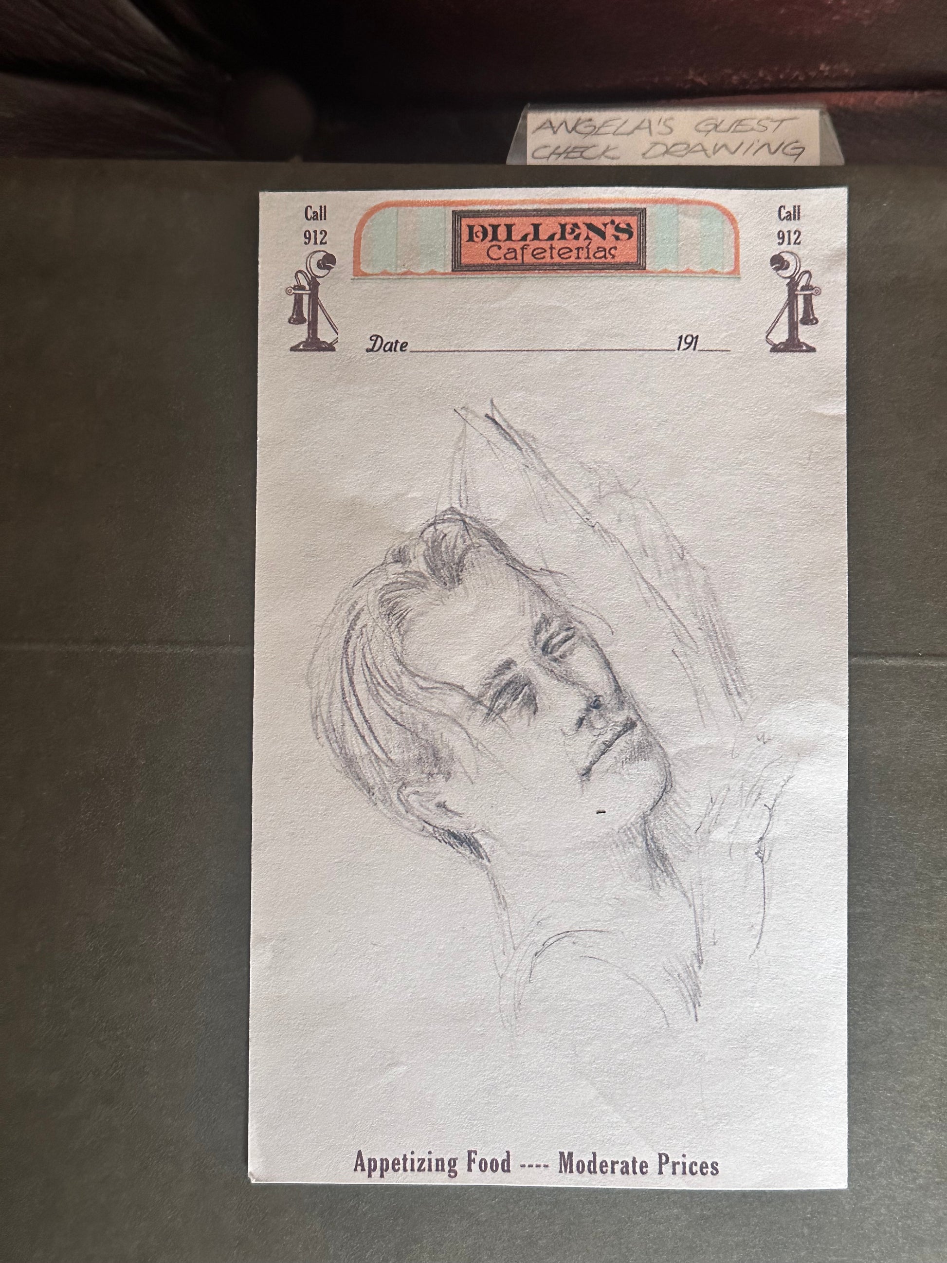 This detailed sketch, made on a Dillen’s Cafeteria notepad, was used in Boardwalk Empire as a piece of Angela Darmody’s (Aleksa Palladino) artwork. Featured in Season 2, Episode 10 (“Georgia Peaches”), the drawing reflects Angela’s artistic aspirations and personal struggles. As a deeply creative and emotionally conflicted character, Angela’s sketches were an outlet for her unspoken desires and her search for meaning beyond her life with Jimmy Darmody. This intimate prop is a rare and evocative artifact from the series.