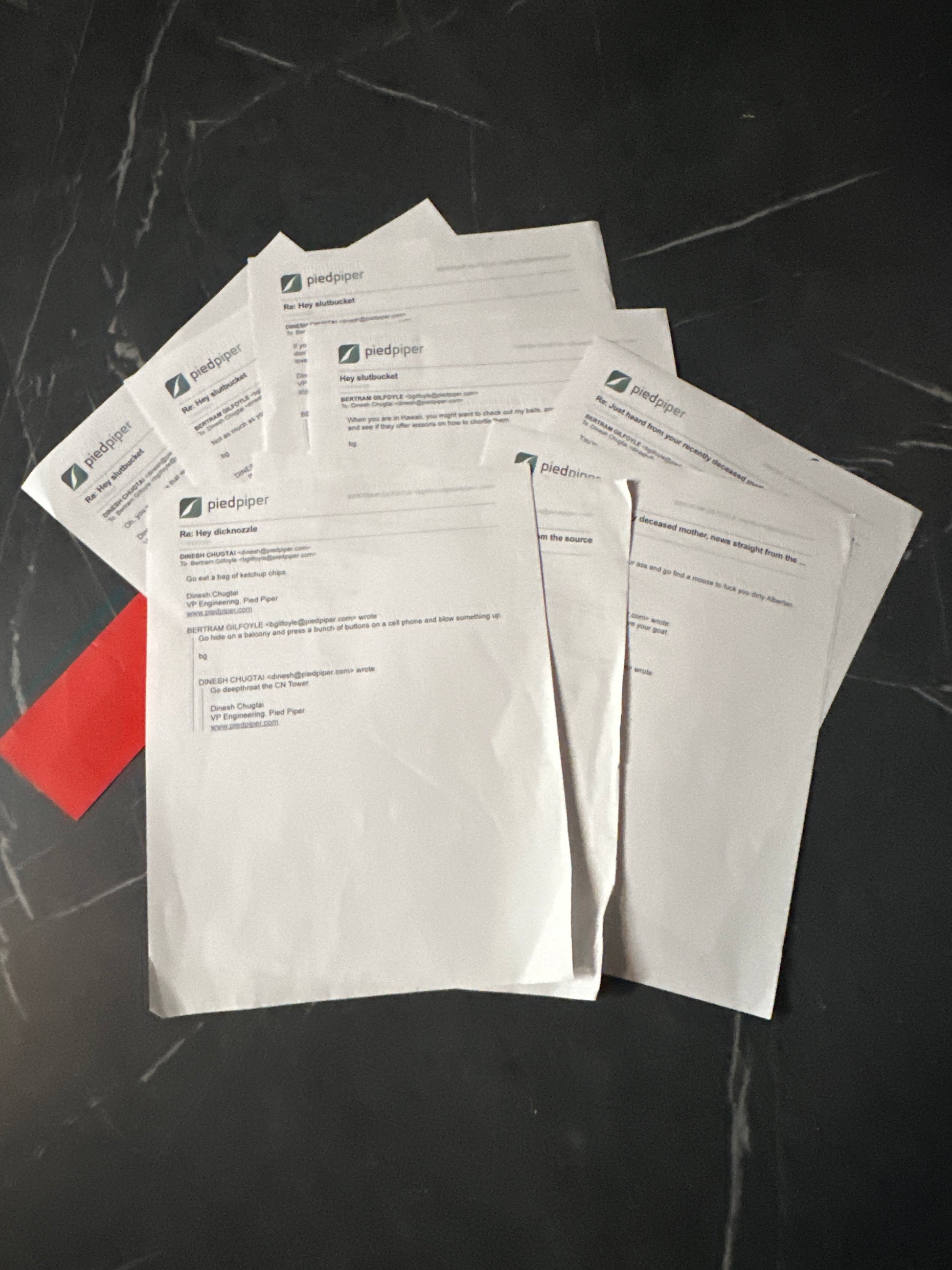 Dinesh and Gilfoyle's long and hateful feud continues online in their internet correspondence. These internal emails between the two consist of original insults and puns from the two senior coders. Includes insults like "go buy another anime pillow to fall asleep with" from Dinesh and "Satan never loved you" Gilfoyle. The emails are printed on normal 8.5x11 paper sheets.