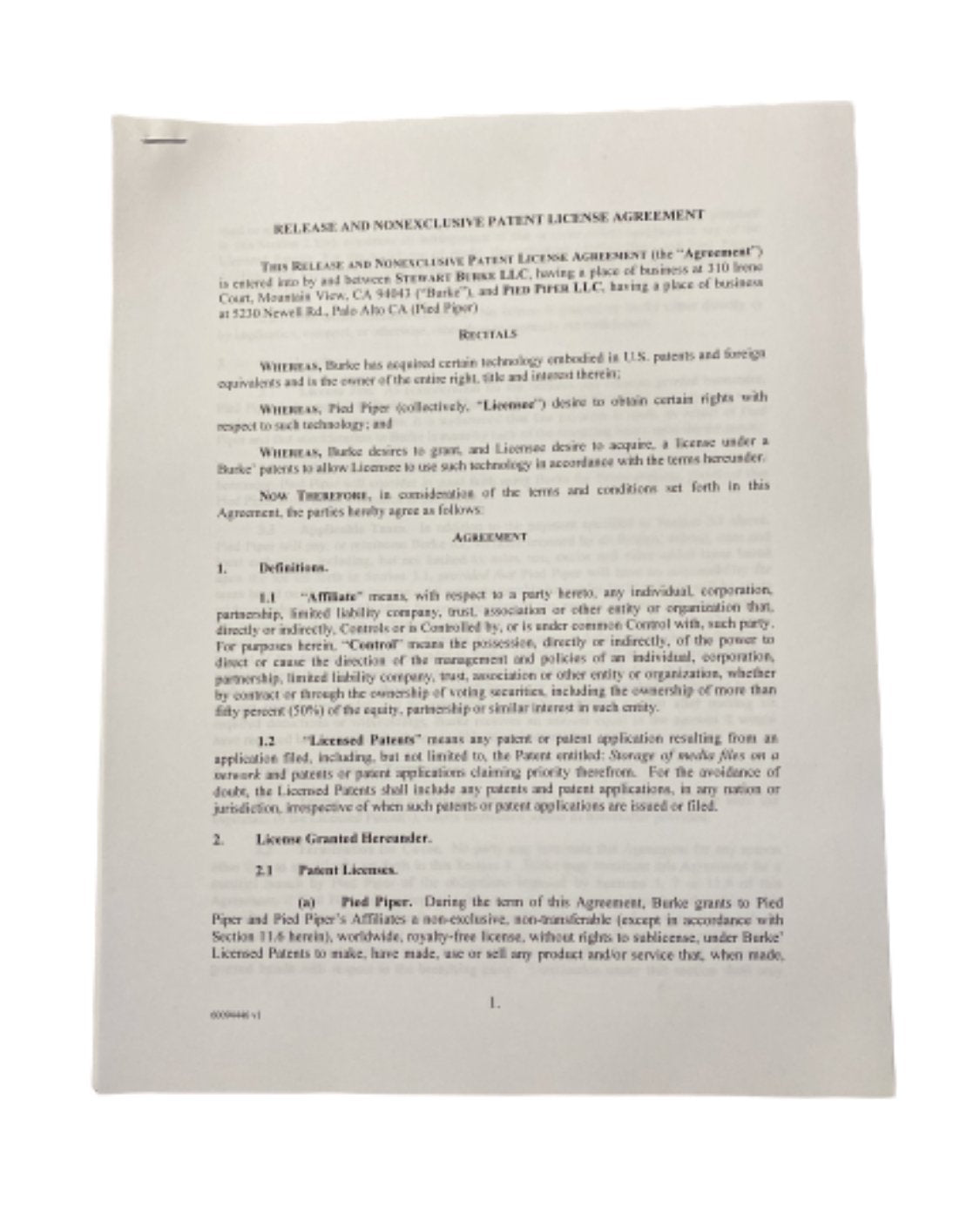 Stewart Burke LLC Release and Nonexclusive Patent License Agreement with Pied Piper from episode 706. This item was used on the hit HBO series, SILICON VALLEY, and it comes with a certificate of authenticity.